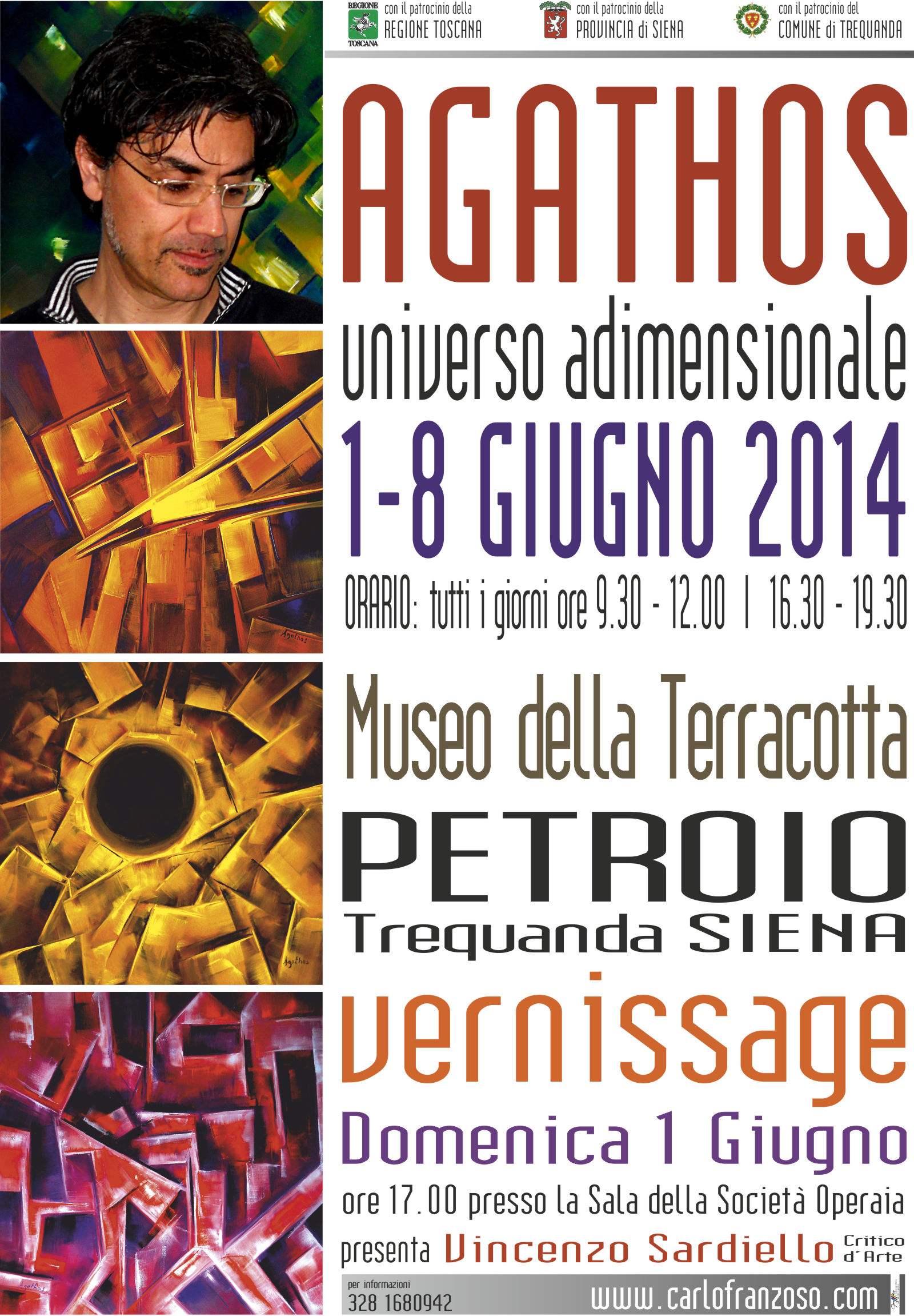 Domenica 1 giugno alle ore 17,00 presso la Sala della Società Operaia del Museo della Terracotta di Petroio, in via Valgelata, si inaugurerà la personale di pittura di Agathos dal titolo “Universo Adimensionale”. La mostra, patrocinata dal Comune di Trequanda di cui Petroio è frazione, dalla Provincia di Siena e dalla Regione Toscana resterà aperta sino a domenica 8 giugno.