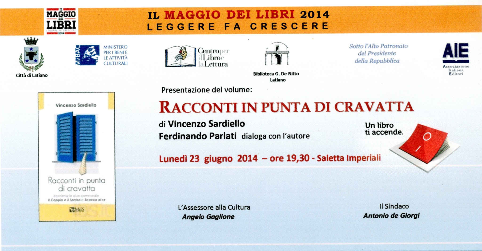 Ultimo appuntamento con la rassegna Libri, Autori, Lettori, organizzata dalla Biblioteca Civica De Nitto e dall’Assessorato alla Cultura Città di Latiano. Lunedì 23 giugno, alle ore 19.30, presso la Saletta Imperiali, Fernando Parlati dialogherà con l’autore Vincenzo Sardiello che presenterà il suo libro dal titolo Racconti in punta di cravatta.