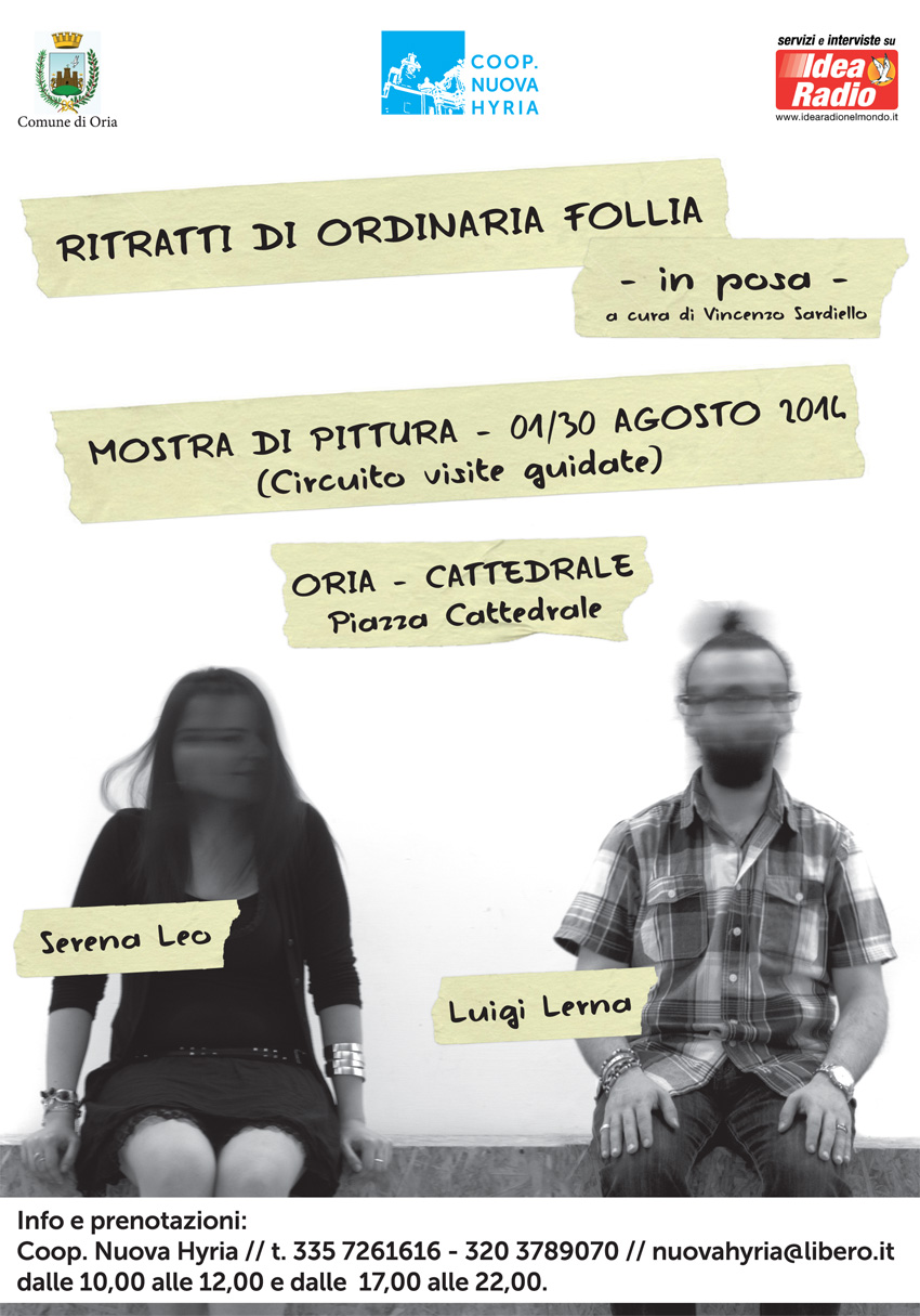 L’offerta del circuito visite guidate della città di Oria della Cooperativa “Nuova Hyria” si arricchisce di un nuovo tassello artistico. Da un’idea di Lucia Locorotondo nasce la mostra “Ritratti di ordinaria follia – in posa” di Serena Leo e Luigi Lerna a cura di Vincenzo Sardiello.
