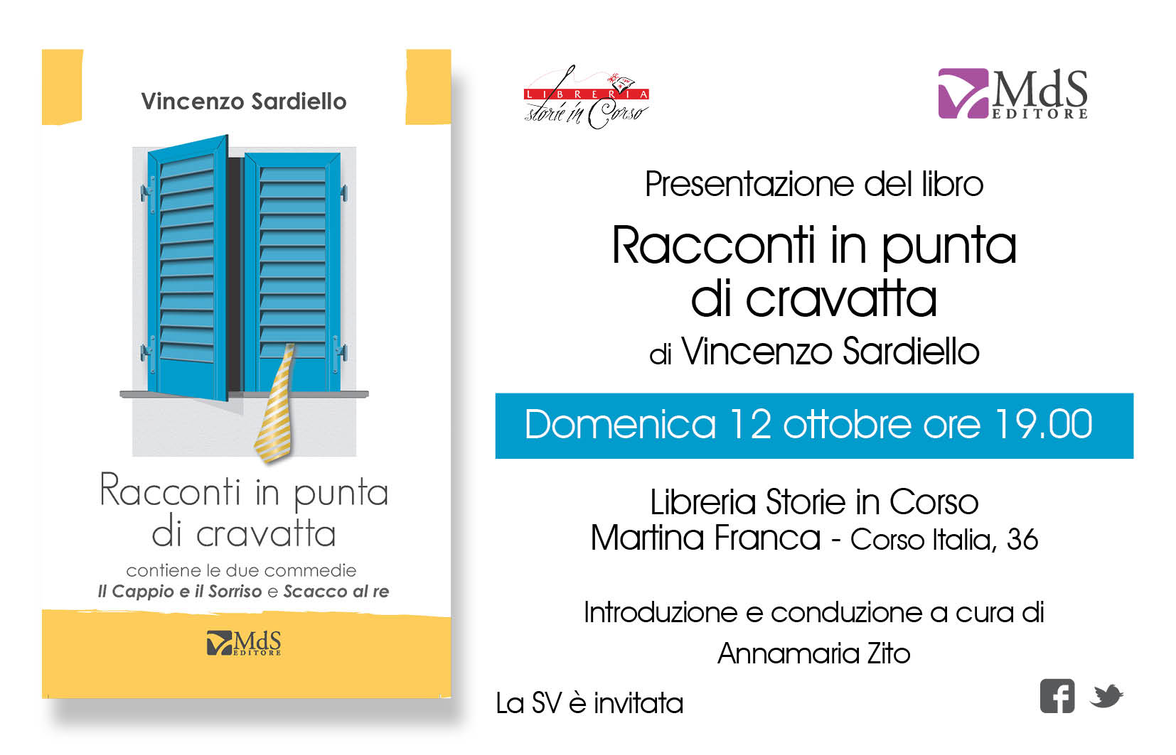 La libreria “Storie in corso ” presenta domenica 12 ottobre alle ore 19.00 presso la propria sede in Corso Italia, 36 a Martina Franca, il libro “Racconti in punta di cravatta” di Vincenzo Sardiello. A dialogare con l’autore sarà la scrittrice Annamaria Zito.