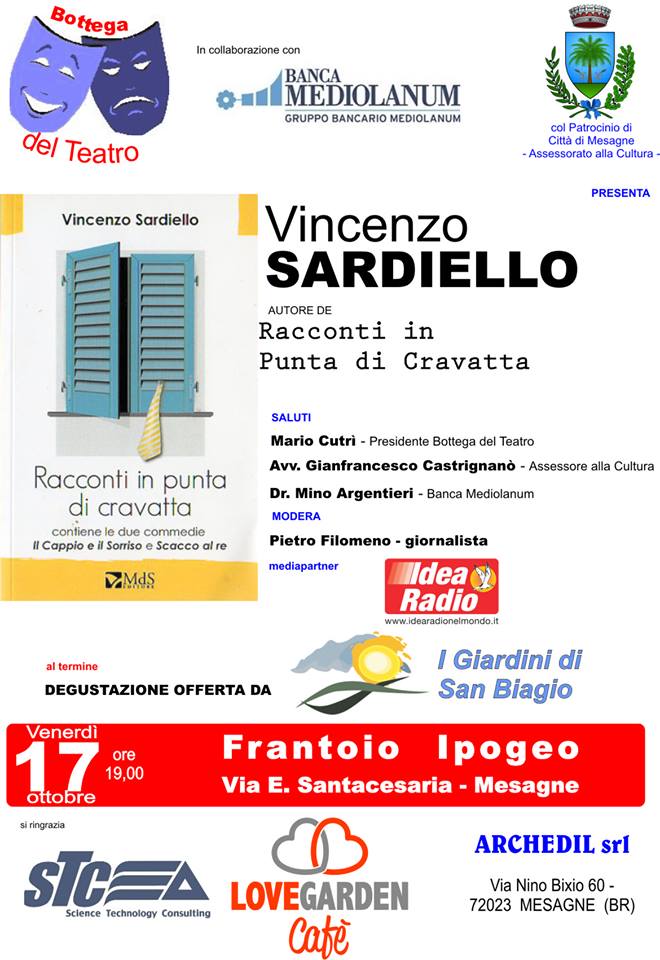 La Bottega del Teatro di Mesagne, in collaborazione con la Banca Mediolanum e con il patrocinio del Comune di Mesagne – Assessorato alla Cultura, presenta venerdì 17 ottobre alle ore 19.00 presso il Frantoio Ipogeo, in via Santacesaria a Mesagne, il libro “Racconti in punta di cravatta” di Vincenzo Sardiello.