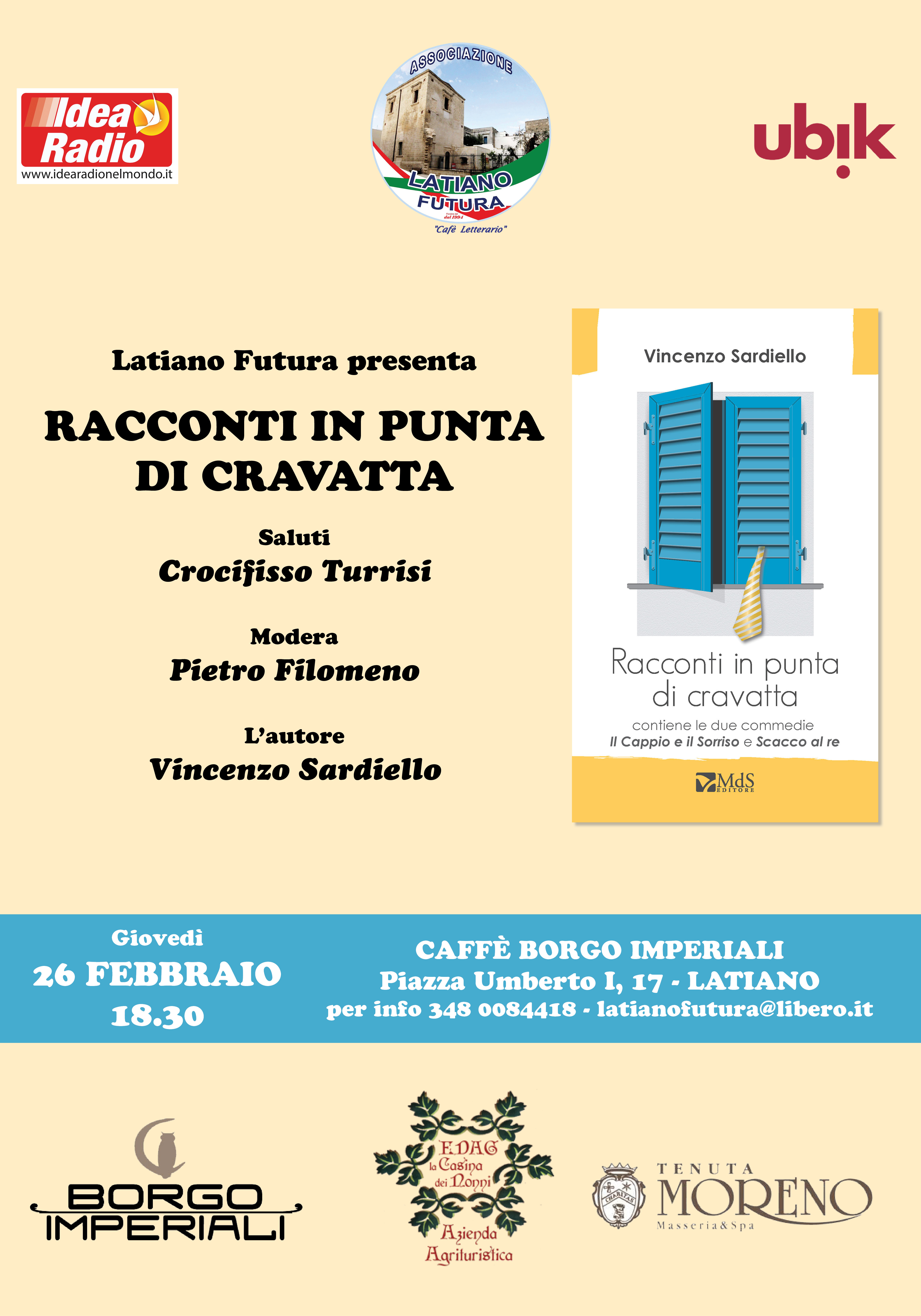L’associazione Latiano Futura, in collaborazione con la Libreria Ubik di Francavilla Fontana e Idea Radio, e con il supporto del Caffè Borgo Imperiali, di Tenuta Morena e della Casina dei Nonni organizza giovedì 26 febbraio alle ore 18.30 presso il Caffè Borgo Imperiali in Piazza Umberto I, 17, a Latiano, il libro “Racconti in punta di cravatta” di Vincenzo Sardiello.