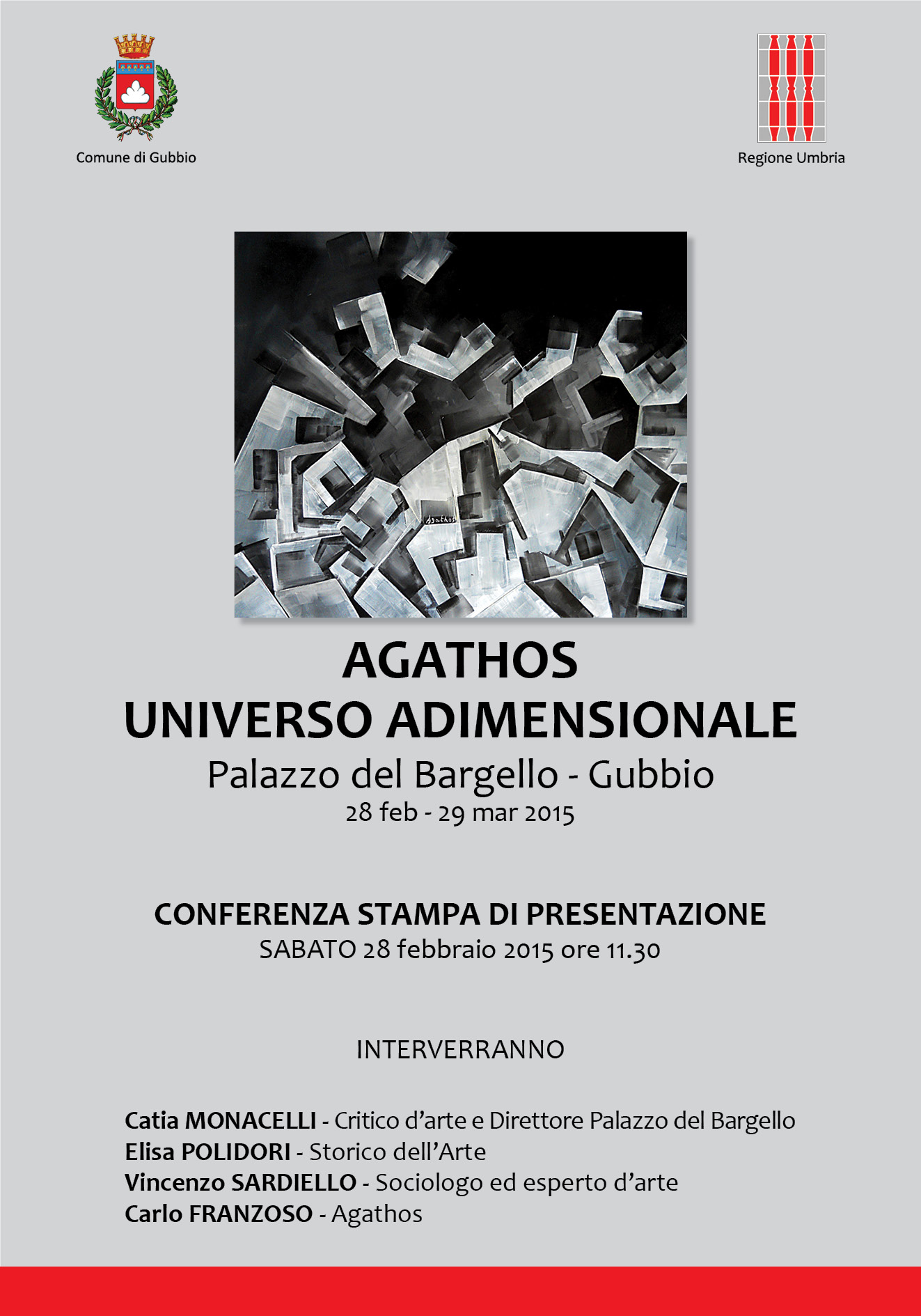 Sabato 28 febbraio alle ore 10,30 al Palazzo del Bargello di Gubbio si inaugurerà, con una conferenza stampa pubblica, la personale di pittura di Agathos dal titolo “Universo Adimensionale”. La mostra, patrocinata dal Comune di Gubbio e dalla Regione Umbria resterà aperta sino a domenica 29 marzo.