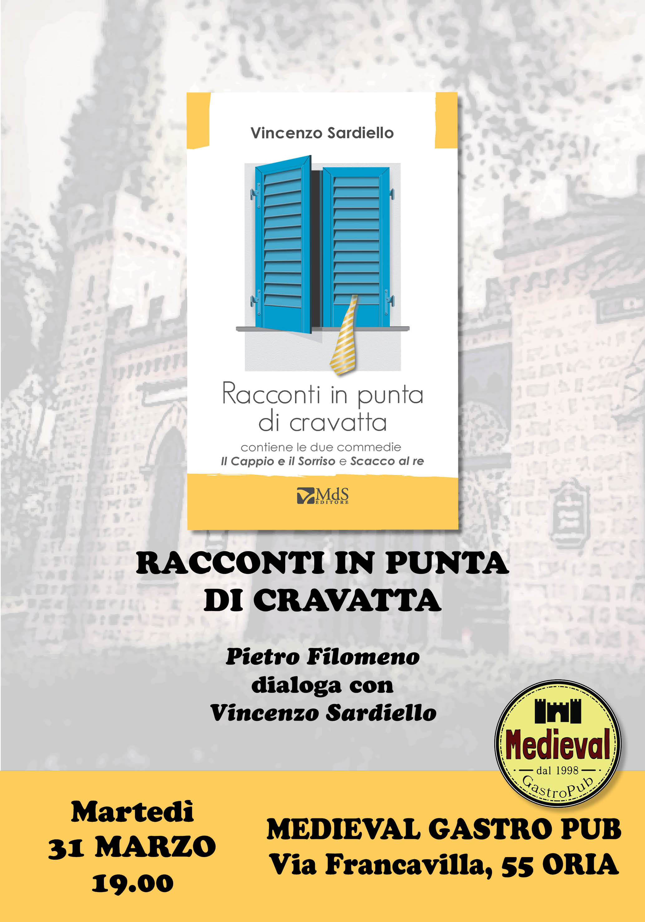 Appuntamento letterario per il Medieval Gastro Pub di Oria che organizza martedì 31 marzo alle 19.00 la presentazione del libro “Racconti in punta di cravatta” di Vincenzo Sardiello. A dialogare con l’autore sarà il giornalista Pietro Filomeno.