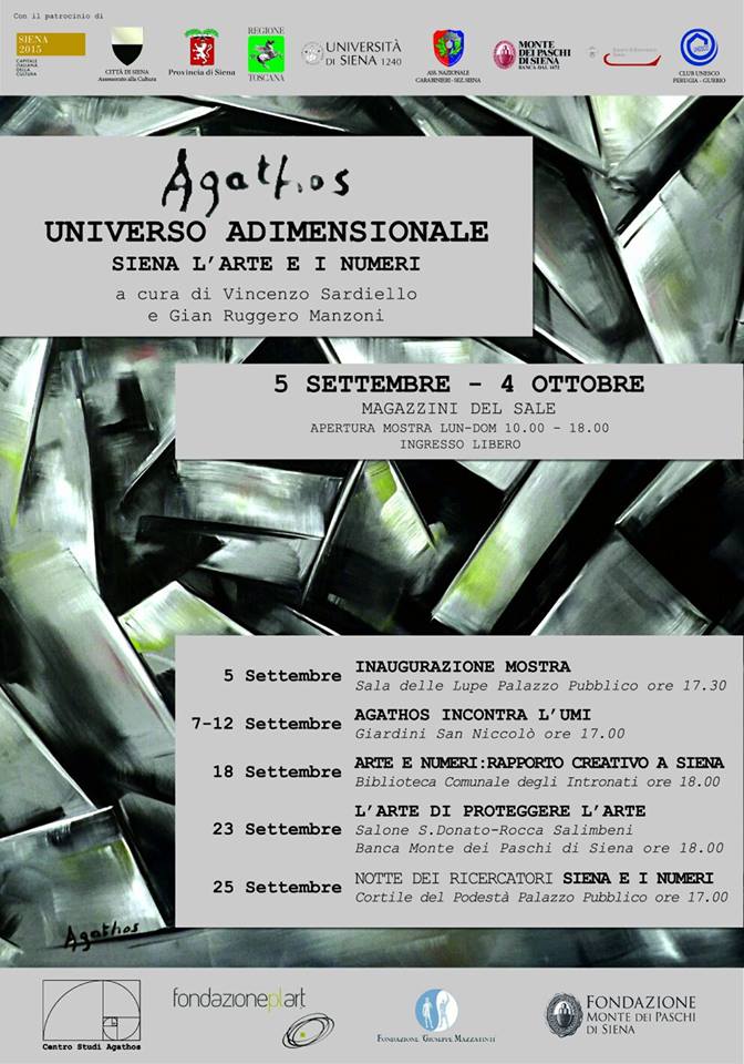 Sabato 5 settembre alle ore 17,30 presso la Sala delle Lupe nel Palazzo Pubblico di Siena si inaugurerà la personale di pittura di Agathos “Universo Adimensionale”. La mostra, patrocinata dal Comune di Siena – Assessorato alla Cultura, dalla Provincia di Siena, dalla Regione Toscana, dall’Università di Siena, dalla Camera di Commercio di Siena, dal Monte dei Paschi di Siena, dall’Associazione Nazionale Carabinieri sezione di Siena, dal CP Club UNESCO Perugia – Gubbio, dalla Fondazione Plart, dalla Fondazione del Monte dei Paschi di Siena, dalla Fondazione Giuseppe Mazzatinti e dal Centro Studi Agathos, resterà aperta sino al 4 ottobre 2015 presso i Magazzini del Sale.