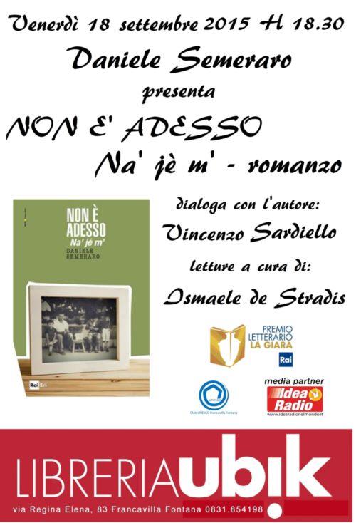 Venerdì 18 settembre, alle ore 18.30, presso la libreria Ubik di Francavilla Fontana in via Regina Elena, 83, si terrà la presentazione del libro “Na’ jé m’ – Non è Adesso” (Rai Eri) di Daniele Semeraro, vincitore del premio “La Giara” promosso dalla Rai.