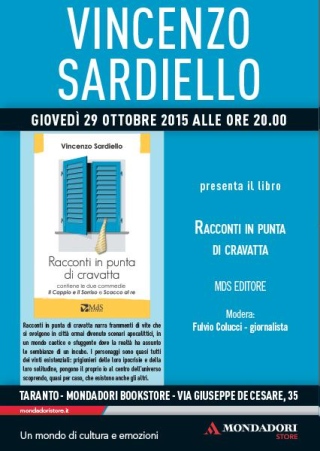 Giovedì 29 ottobre alle 20.00 alla libreria Mondadori, in via Giuseppe De Cesare, 35, a Taranto, sarà presentato il libro di Vincenzo Sardiello “Racconti in punta di cravatta“. Dialogherà con l’autore il giornalista e scrittore Fulvio Colucci.