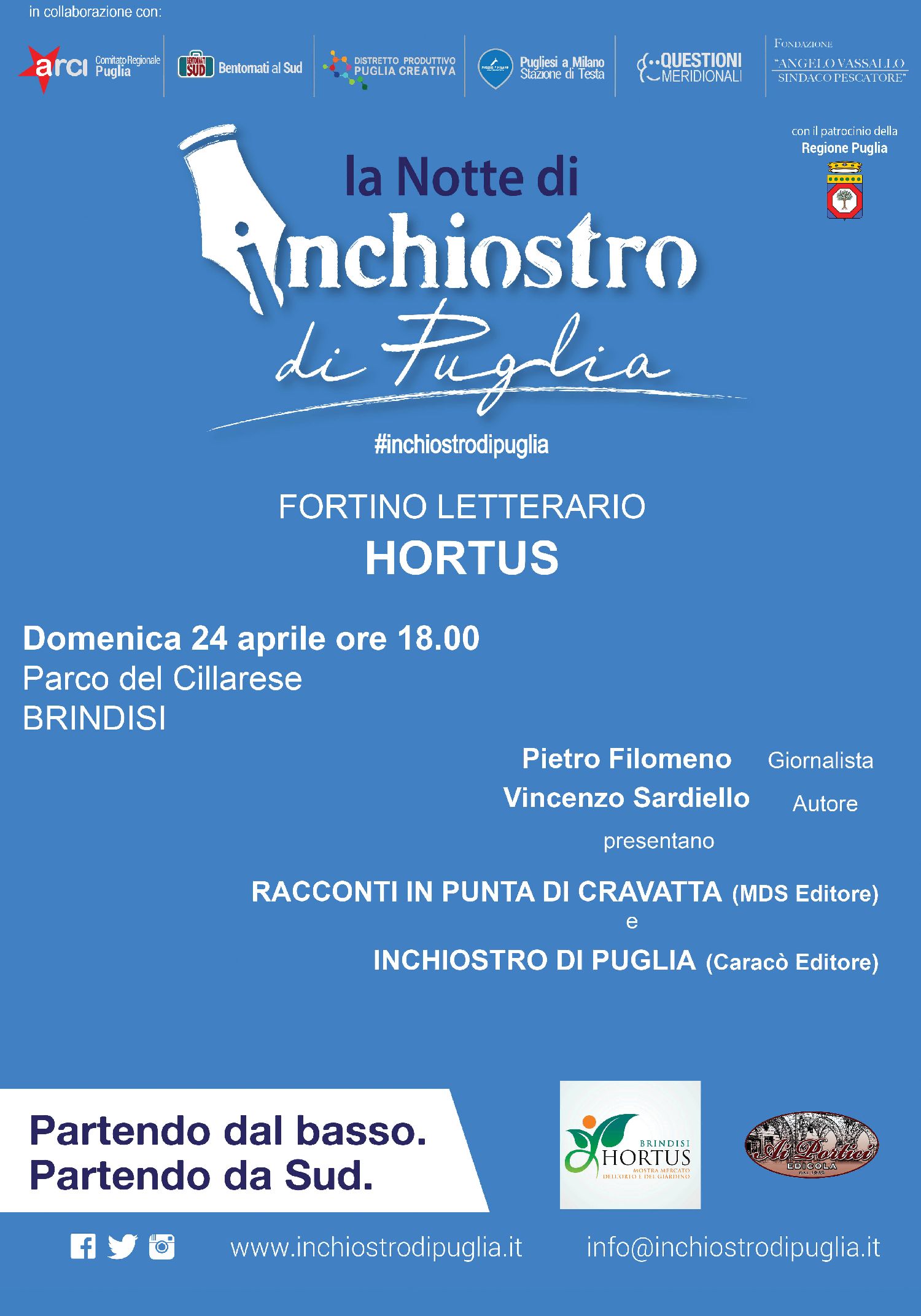 A presidiare il fortino di Hortus, che si preannuncia come green per eccellenza, ci saranno l’autore Vincenzo Sardiello e il giornalista Pietro Filomeno che, dopo i saluti del Presidente dell’Associazione Hortus Puglia e coordinatore di Hortus Brindisi Pierangelo Argentieri, presenteranno il libro di Sardiello “Racconti in punta di cravatta” (Mds Editore), e il volume “Inchiostro di Puglia” (Caracò Editore).